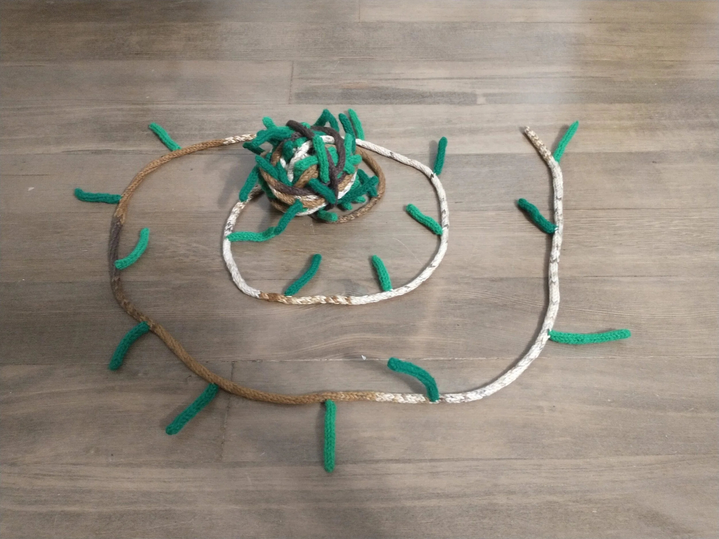 My fiber sculpture Cervus Euphoria lives in the room as he's part of this larger scale art project. I imagine that our fireplace is actually a large tree with a special magic hole for the fire. On either side of the woodstove are bookshelves that I see as branches of the tree. I'm currently making willow branches out of upcycled yarn. When finished they will hang over the books from curtain rods.